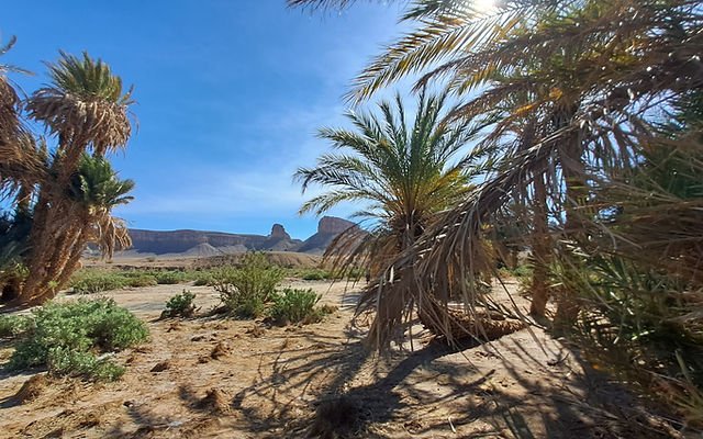 The Laarjimia Oasis, made up of date palms, is an important stopping point for nomadic herds that come to drink from the well. In the shade of these palms, we will take the time to enjoy a delicious lunch cooked over a wood fire and sip traditional mint tea. You will be able to explore the area and climb the nearby hills to gain height and enjoy breathtaking views of the surrounding landscapes. Take in the calm of this wild environment and appreciate the full diversity of nature in these unique settings.