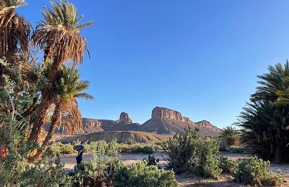 In the morning, we will depart in a 4x4 along the track from Foum Zguid, heading toward the oasis located 25 km away. We will cross part of the Iriki National Park, at the edge of the desert, through ochre-colored hills. In the distance, the table mountains gradually appear, revealing the vastness of these spaces amidst the wide plains.