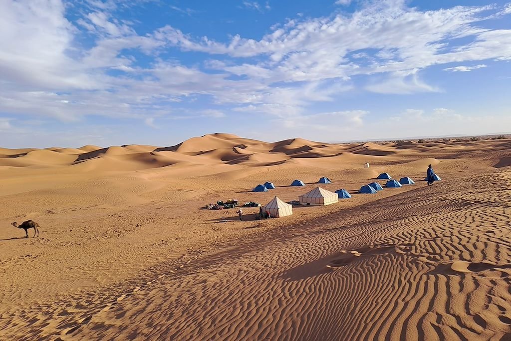 Partez à la découverte du désert marocain à travers une expérience authentique : nuits en bivouac sauvage sous un ciel étoilérandonnées parmi les dunes dorées, et immersion totale dans le silence, la sérénité et la culture nomade.